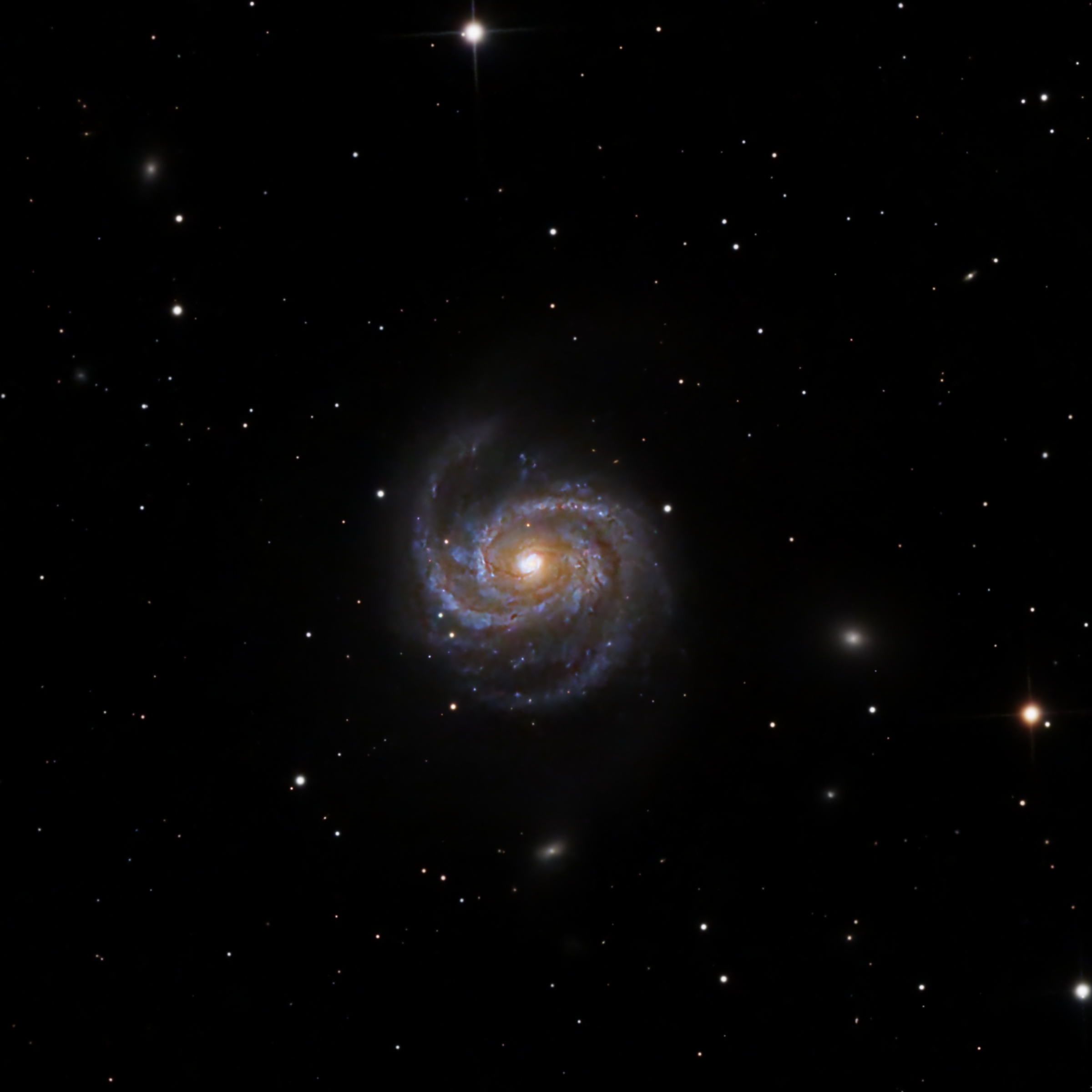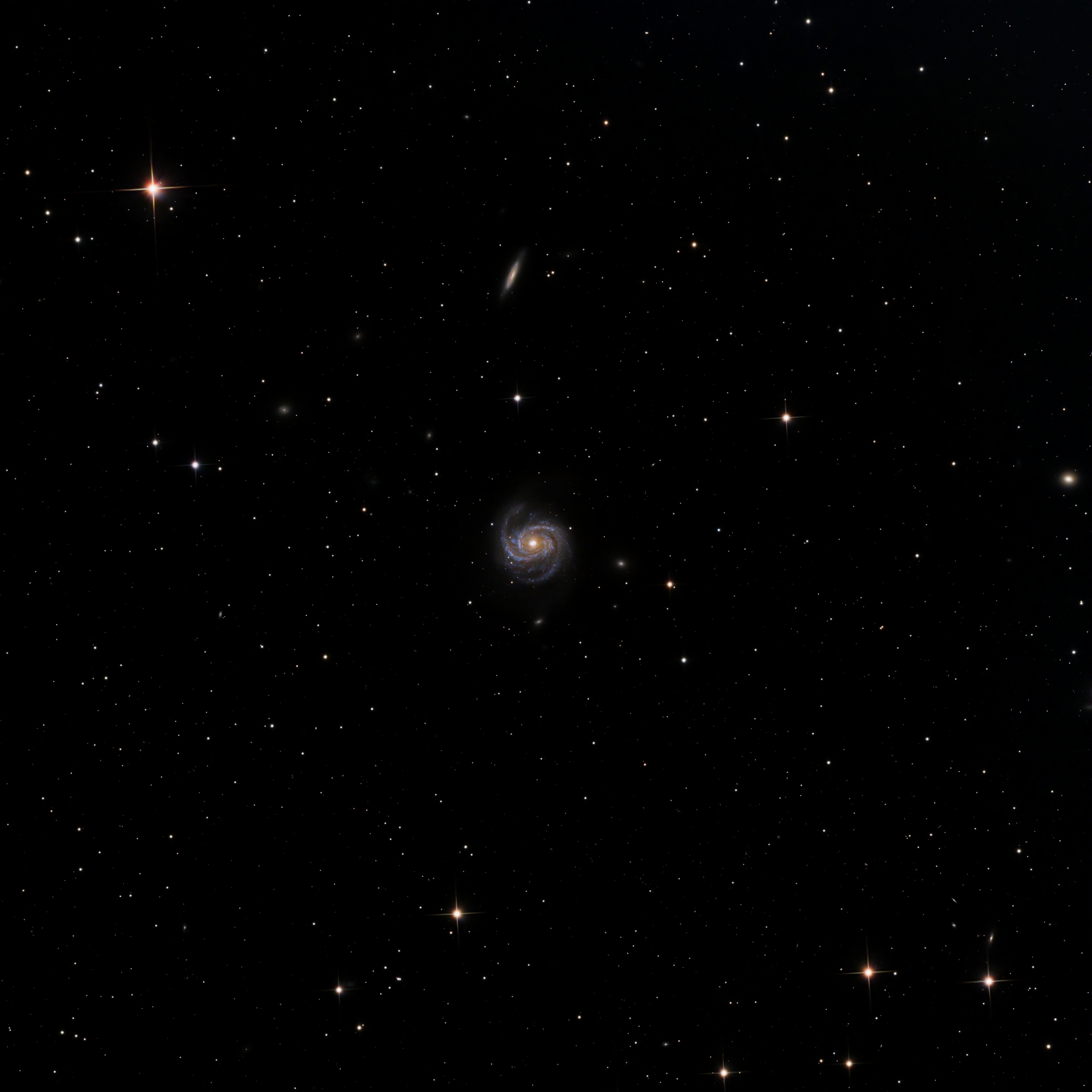 The area around M100 is part of the Virgo cluster of Galaxies. A group of about 2,500 galaxies. M100 is the brightest galaxy in thie photo. Above M100, and half-way to the top, is the edge on galaxy NGC4312. If you zoom in, you will see dozens of tiny, faint and fuzzy galaxies.