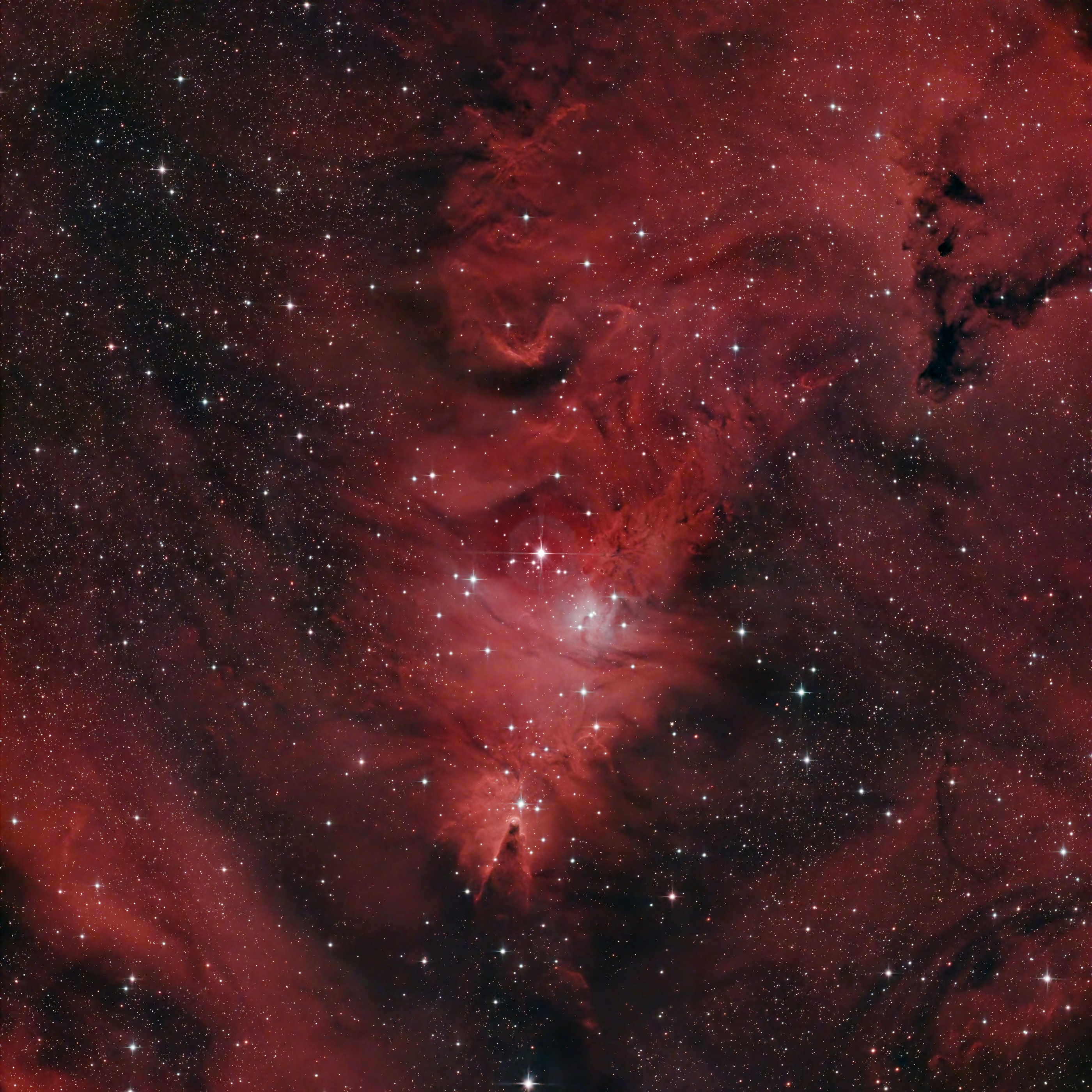 NGC2264, The Christmas Tree Cluster and the Cone Nebula are located in the Monoceros constellation about 2,300 light-years from Earth. The Christmas Tree Cluster is a young open star cluster that resembles a Christmas tree. In this image the Christmas tree appears upside-down. The Cone Nebula is a dark cloud of dust and gas that appears at the apex of the Christmas tree. The Christmas Tree Cluster provides a glimpse into the early stages of stellar evolution. The Cone Nebula is actively forming new stars. The Fox Fur Nebula, Sh2 273, and the Snowflake Cluster are also part of NGC2264.