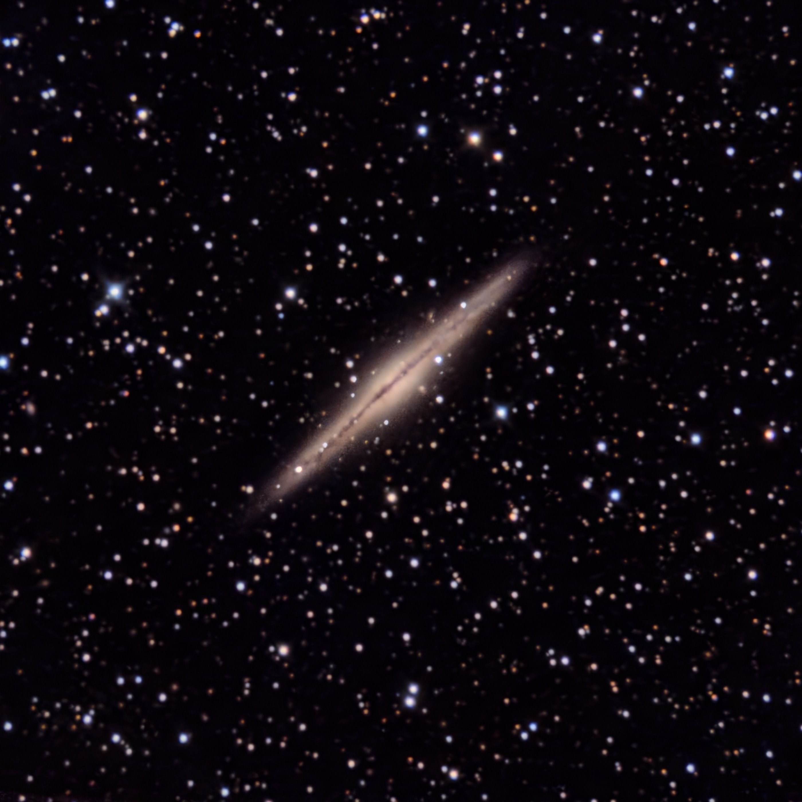 NGC891 (Also known as Caldwell 23 and THE SILVER SLIVER GALAXY) is an edge-on unbarred spiral galaxy about 30 million light-years away in the constellation Andromeda. NGC891 looks as the Milky Way would look when viewed edge-on. Some astronomers have even noted how similar to NGC891 our galaxy looks as seen from the Southern Hemisphere. Both galaxies are considered to be very similar in terms of luminosity and size.