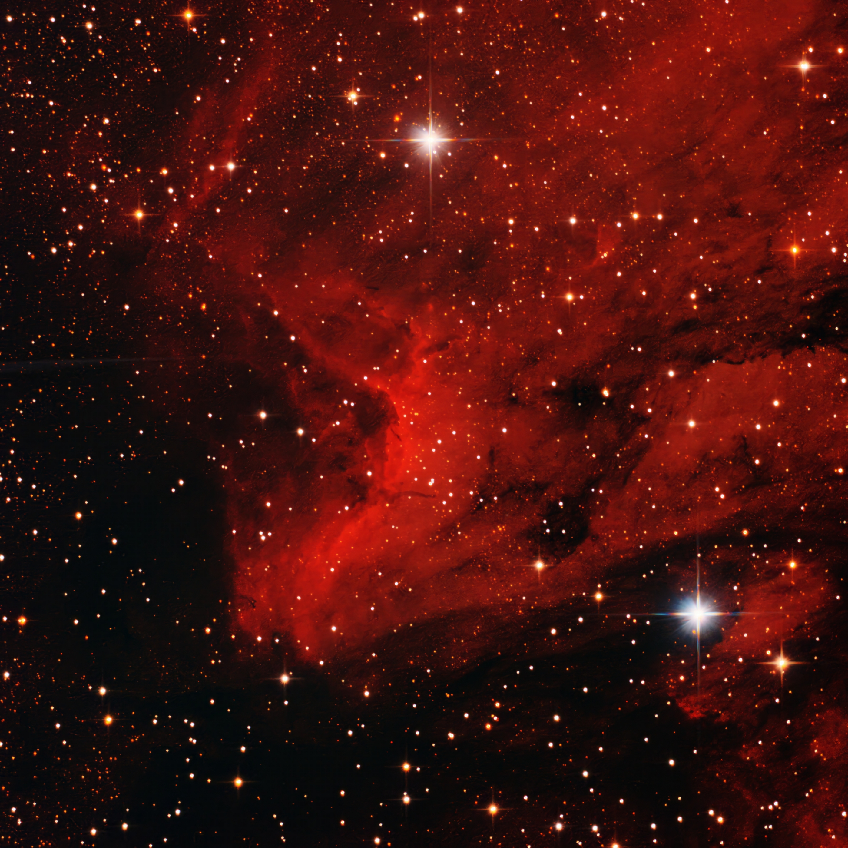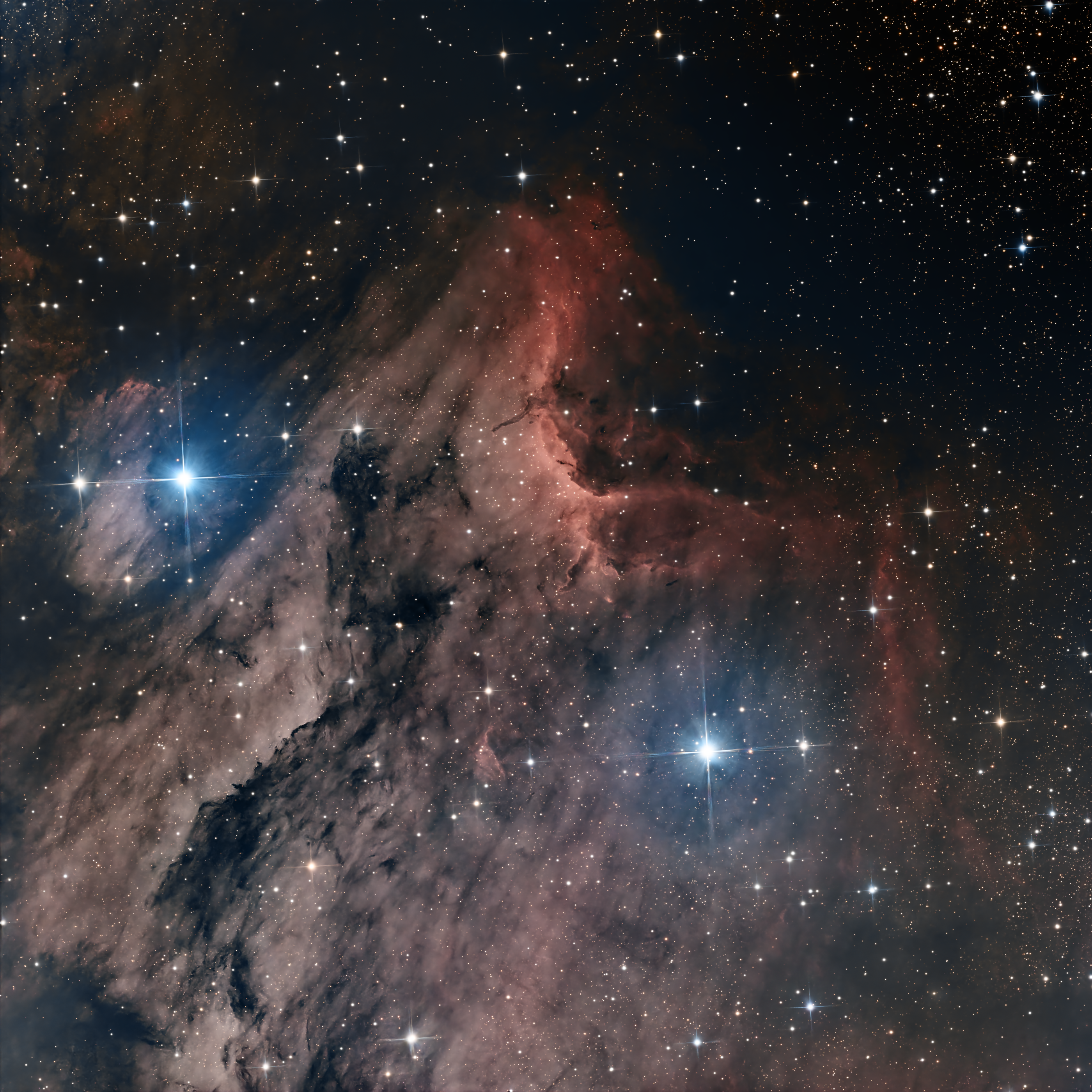 The Pelican Nebula is an emission nebula located near the bright star Deneb in the constellation Cygnus, the Swan. Named for its resemblance to a pelican, the nebula is associated with the neighbouring North America Nebula (NGC 7000) and is one of several notable nebulae found in the area of the Northern Cross. It is an active star forming region with a particularly active mix of star formation and evolving gas clouds. The position and balance of the stars and gas will gradually change to leave the nebula looking completely different millions of years from now. The young stars in the nebula are heating up the cold gas in their vicinity and, as a result, an ionization front gradually moves outward. The Pelican Nebula is listed as IC 5070 and IC 5067 in the Index Catalogue. The nebula itself is catalogued as IC 5070, while IC 5067 is a prominent part of it, found along the curve of the celestial pelican’s head and neck. It is a ridge of emission spanning about 10 light years, home to many newly formed stars. The Pelican Nebula lies at a distance of 1,800 light years. It occupies an area in our sky of 60′ x 50′ and is separated from the considerably larger North America Nebula by a dark molecular cloud. The two nebulae are parts of the same interstellar cloud of ionized hydrogen.
