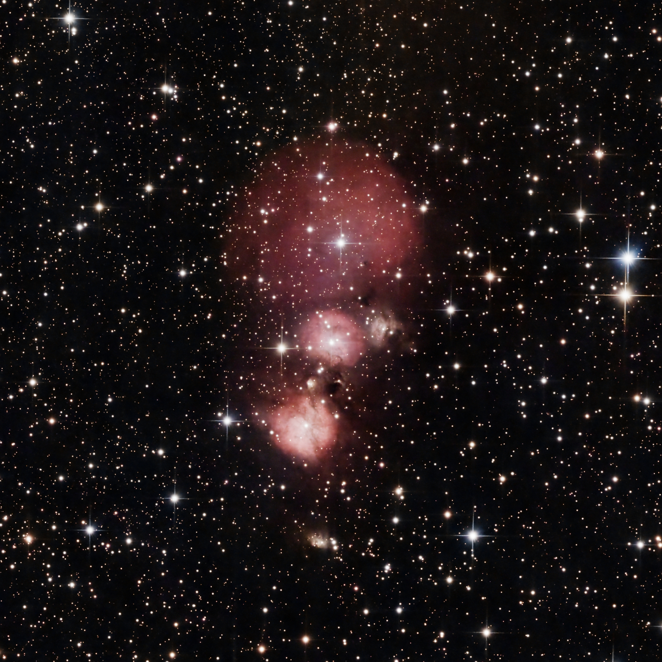 The Mushroom Nebula is a grouping of 3 nebulas that are about 8000 light-years distant. Although they are about the same distance away they do not appear to be associated. The larger but fainter nebula forming the mushroom cap is SH2-254. The smaller and brighter nebula in the center forming the top of the stem is SH2-257. The nebula forming the bottom of the stem is known as IC 2162 or SH2-255. There are two other nebula in the image. To the right of SH2-257 is the small SH2-256. Towards the bottom of the image is the small and faint reflection nebula SH2-258.