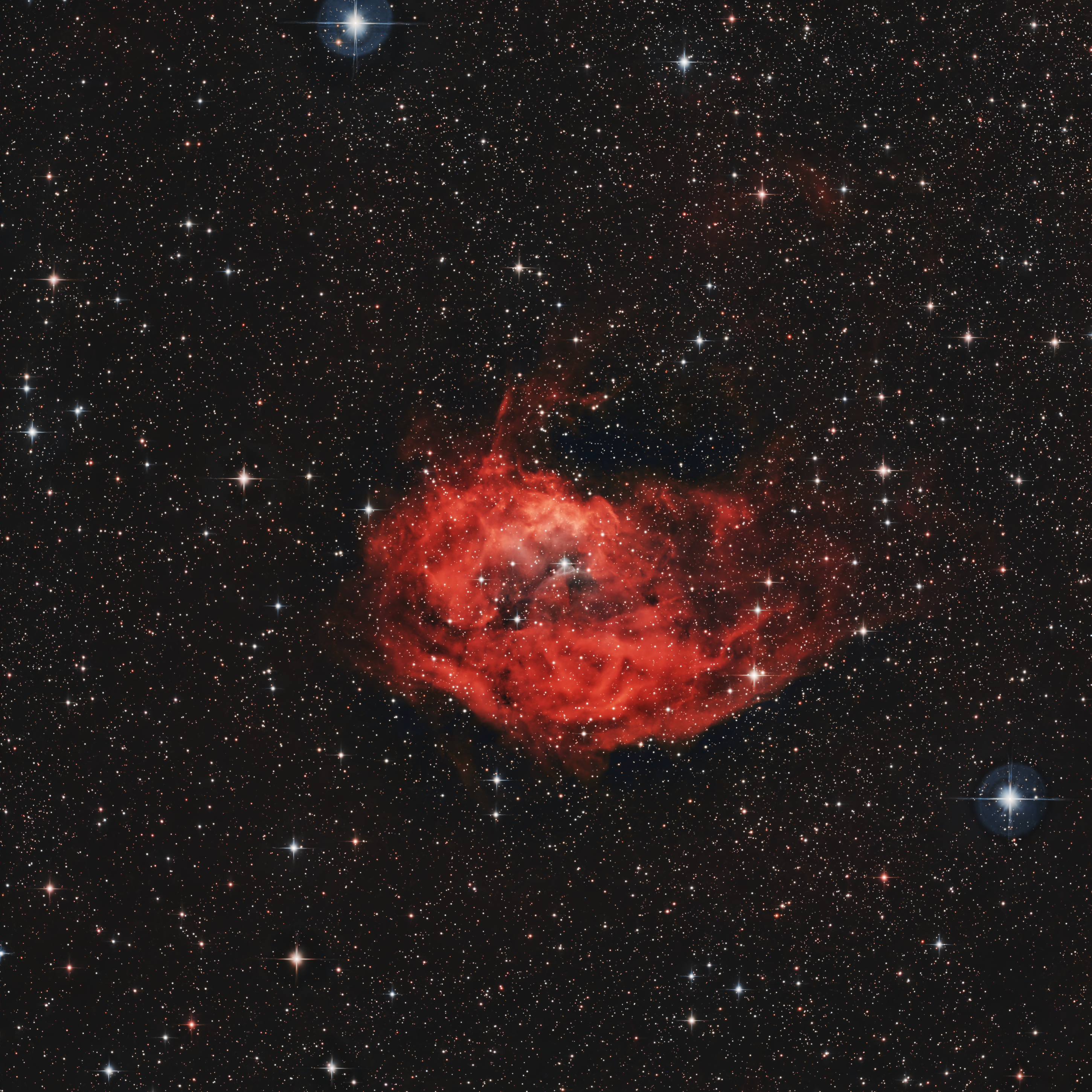 Sh2 261, also known as the Lower Nebula, is an emission nebula visible in the constellation Orion. It lies in the bright wake of the Milky Way opposite the galactic center. One of the stars responsible for the ionization of gases in the region is believed to be the blue star HD 41997. The star is embedded within the nebula and in my picture can be seen slightly above, and a little to the left of the center of the nebula, at about 10 or 11 O'clock. HD 41997 is a runaway star of spectral class O7.5V. Sh2 261 is located approximately 3,200 light years from our solar system. This photo was taken in Kyle, Texas through a 4.5-inch f/4 Telescope, on a ZWO AM5 Mount, with a ZWO ASI533MC PRO color camera plus a dual-band H-Alpha & O-III Filter. The processing was done in PixInsight. The total image acquisition time is: 26 hrs 36 min 00 sec.