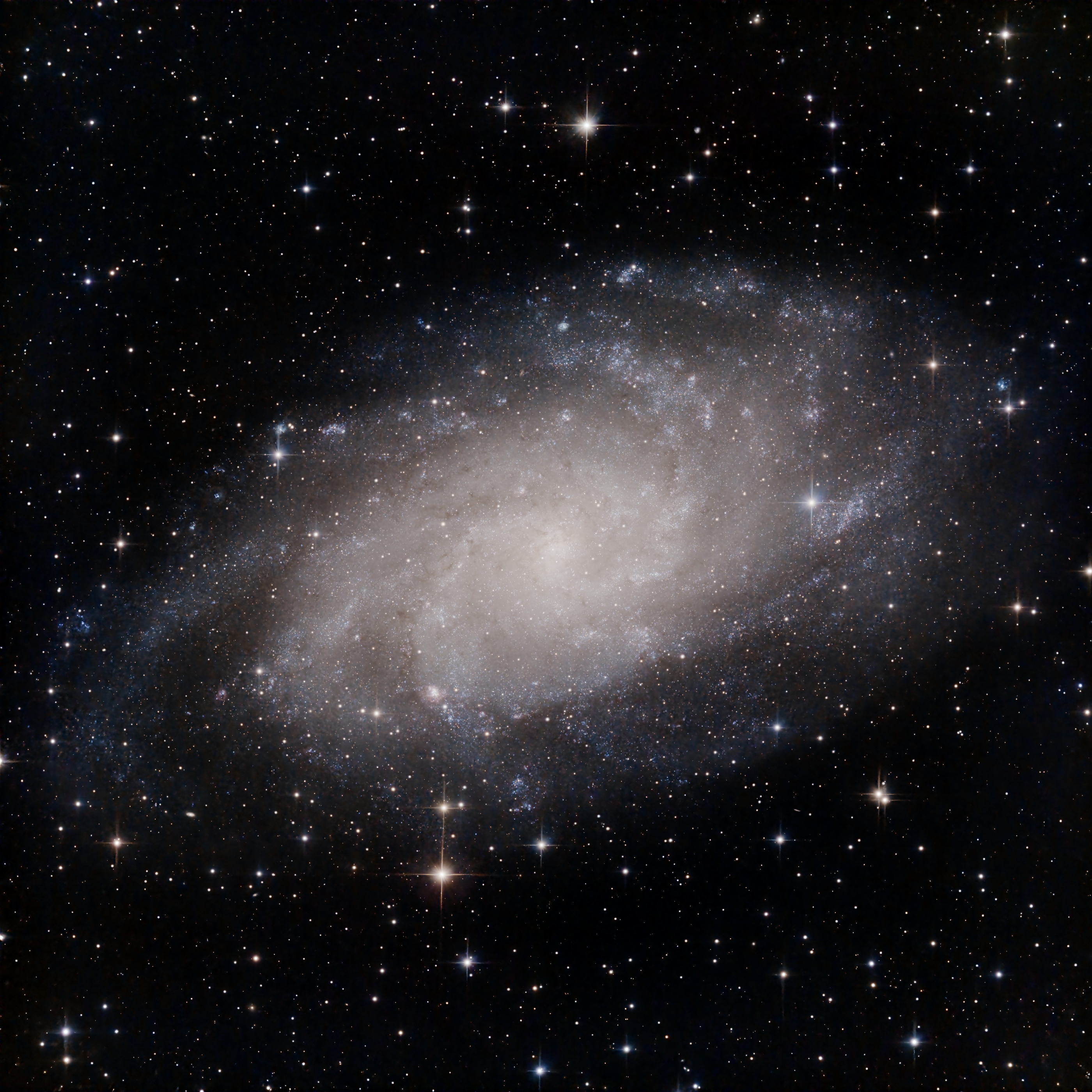 The spiral galaxy M33 is in the triangle-shaped constellation of Triangulum, earning it the nickname, The Triangulum Galaxy. It is about half the size of our Milky Way Galaxy. M33 is the third-largest member of our Local Group of galaxies following the Andromeda Galaxy (M31) and our galaxy the Milky Way. M33 is forming new stars at a rate approximately 10 times the average found in the Andromeda galaxy. The Triangulum Galaxy’s orderly spiral structure displays few signs of interactions with nearby galaxies. However, that could change in the future. M33 is only slightly farther away from us than the Andromeda Galaxy. It is located about 3 million light-years from Earth. M33 appears to be a gravitational companion to Andromeda, and since both galaxies are moving toward our galaxy, M33 could become a third party involved in the impending collision between the Andromeda Galaxy and Milky Way Galaxy. This will happen in about 4 billion years.