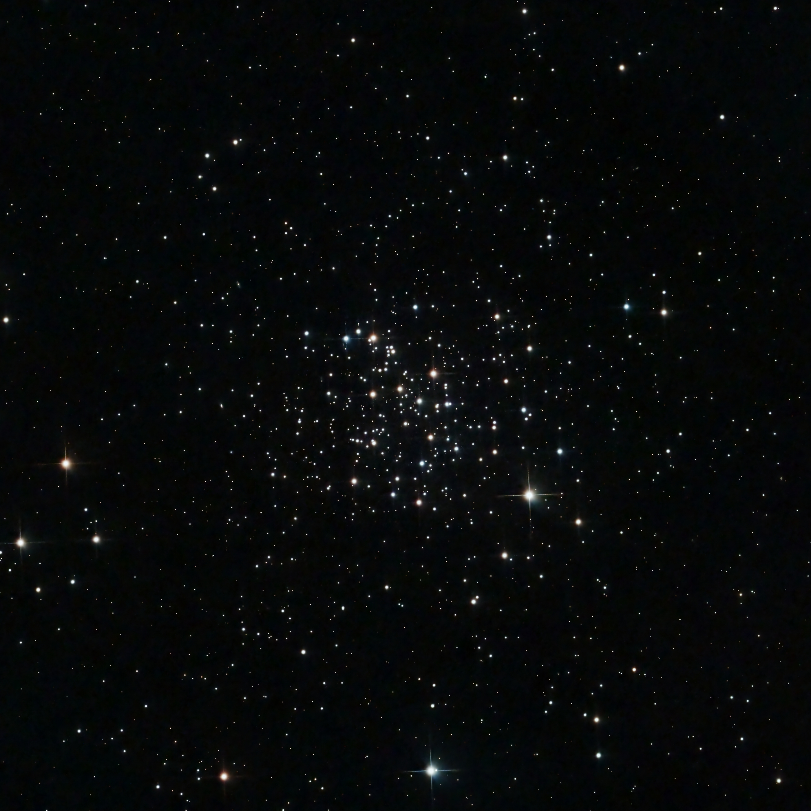 Messier 67, M67, also named NGC2682, is an open cluster in the southern, equatorial half of the constelation Cancer. It is located about 2,800 light-years from Earth. Estimates of its age range between 3.2 and 5 billion years. M67 has more than 100 stars similar to our Sun, and numerous red giants. The total star count is estimated to be over 500.